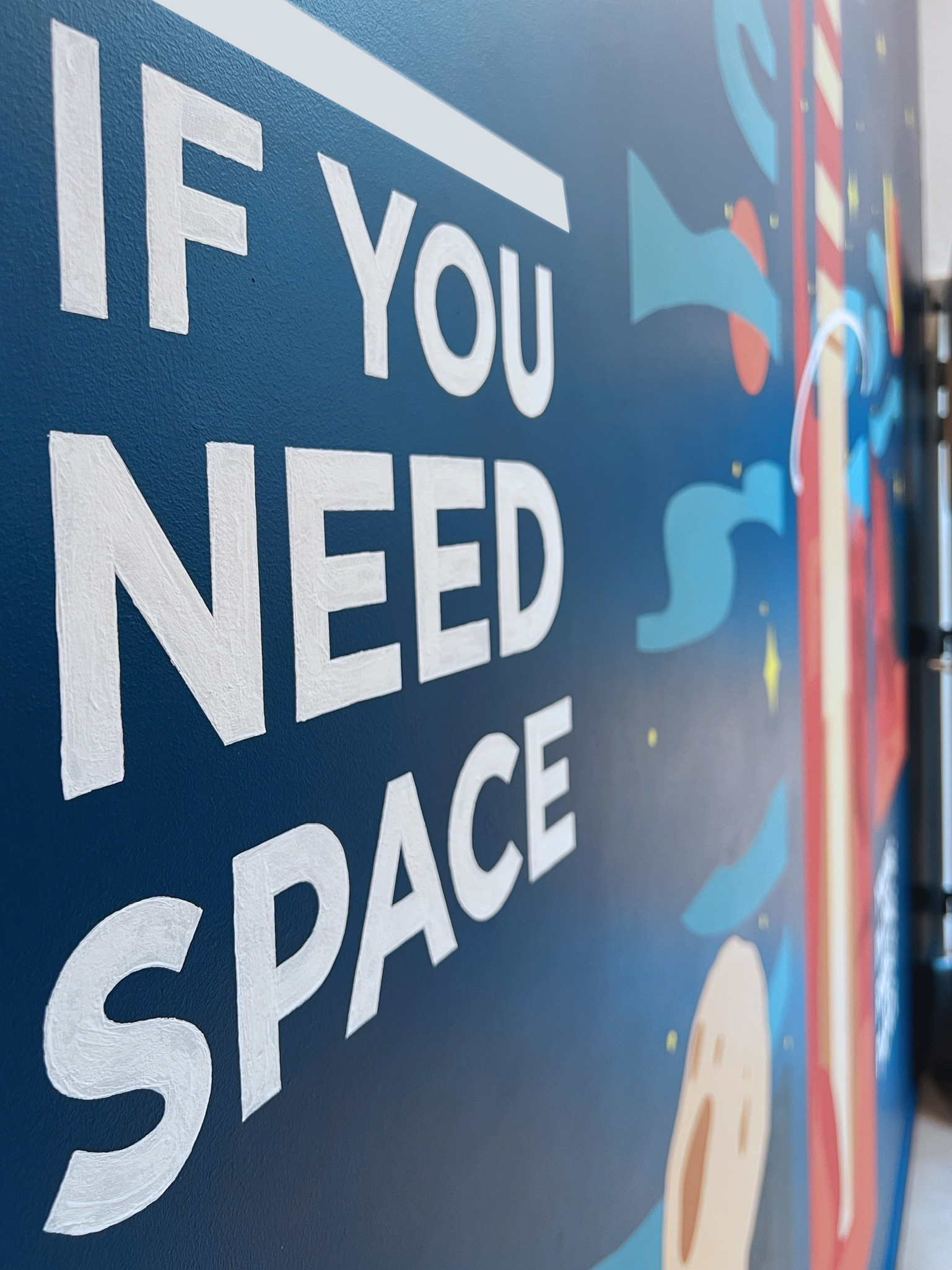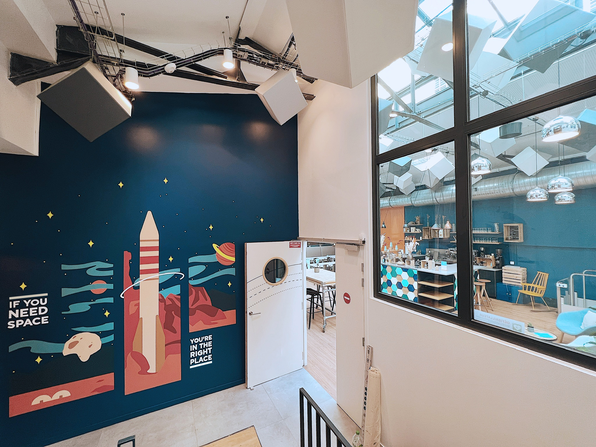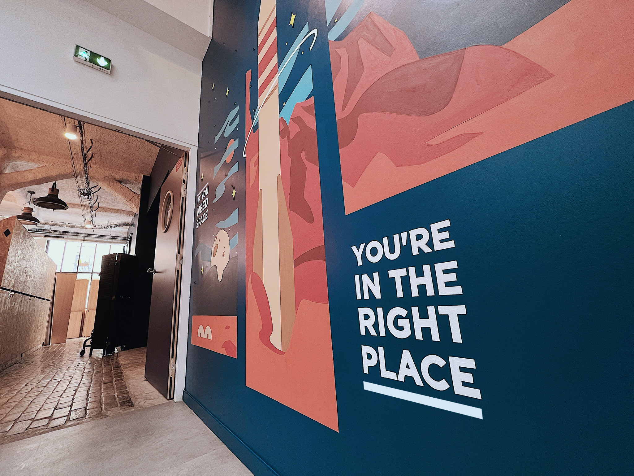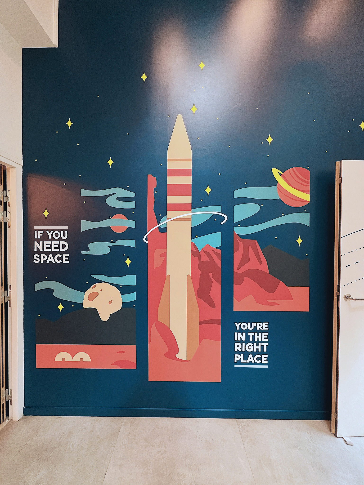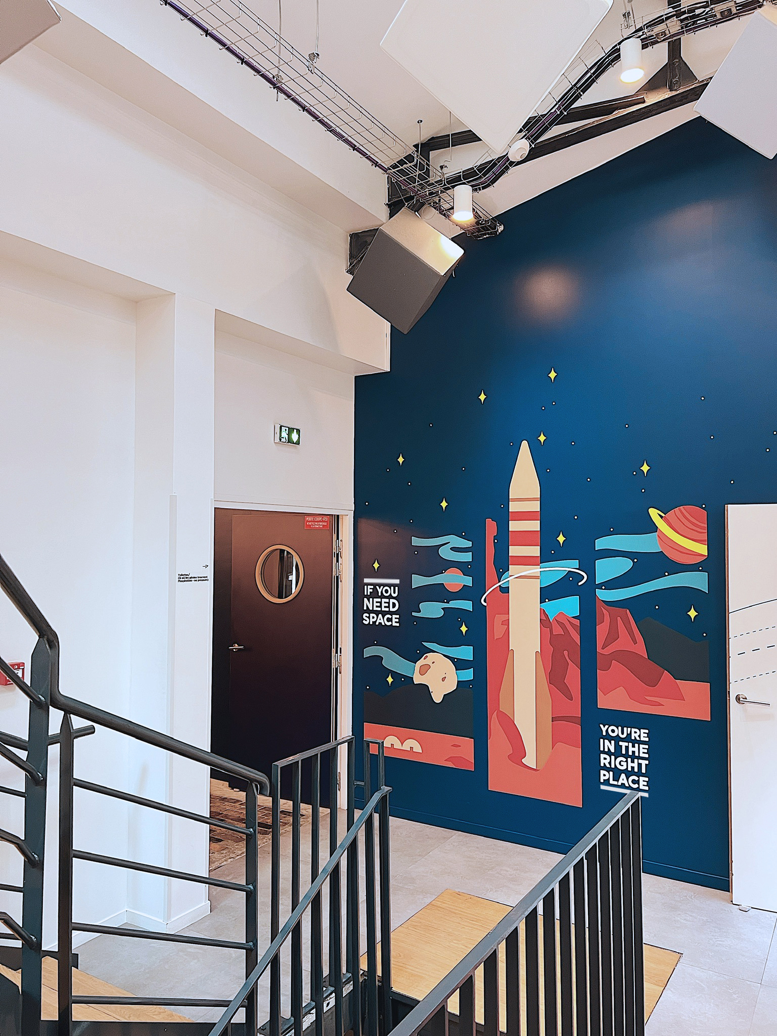 Comet Meetings met à disposition des espaces de réunion pour les entreprises et accorde une attention particulière à l’ambiance et à la décoration de ses locaux. C’est dans un univers spatial que nous avons réalisé cette fresque et il est plaisant de voir notre peinture s’intégrer parfaitement à son environnement.